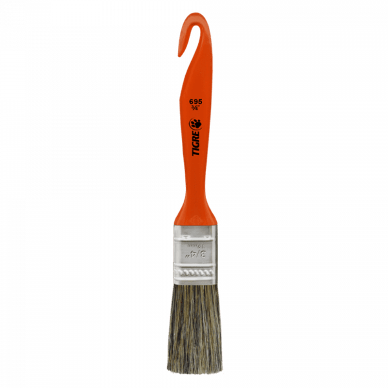 O Pincel Trincha Média 695 3/4" da Tigre possui cabo anatômico plástico modelo anzol e cerda natural branca, indicado para a pintura em paredes e para a aplicação de verniz e stain.